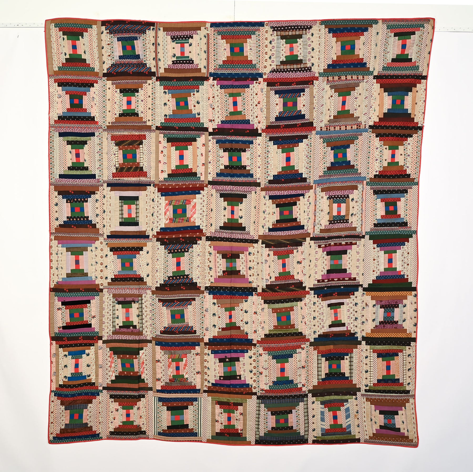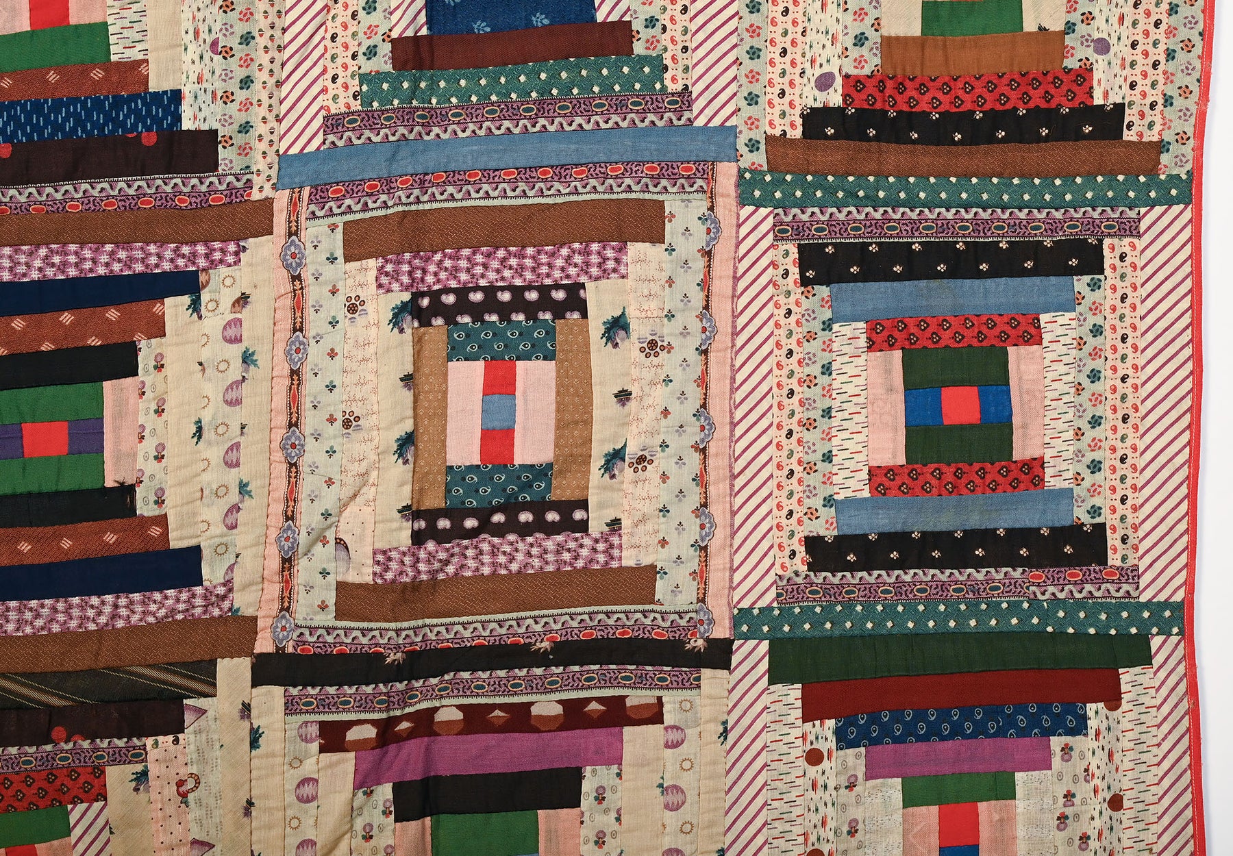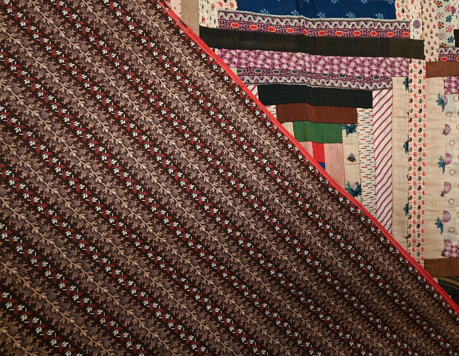 This Courthouse Steps Log Cabin quilt is made of a beautuful mix of wool challis fabrics. The overall tone of the quilt is lighter than one usually sees. Almost all of the fabrics are prints with solid red, blue and green placed in different ways in the centers. The backing is a brown cotton print. The quilt does not have batting as is often the case with Log Cabins of this type. Condition is excellent.