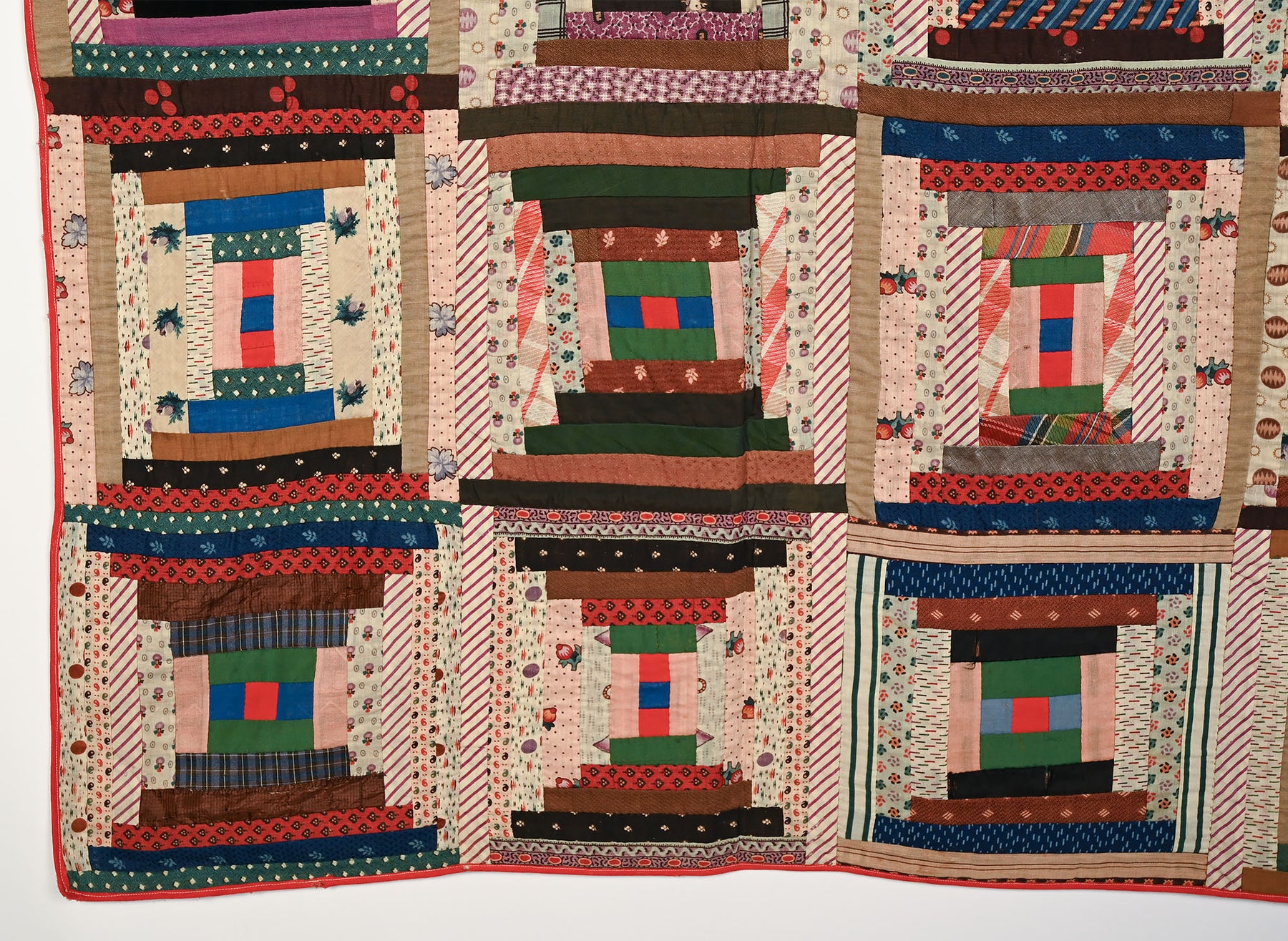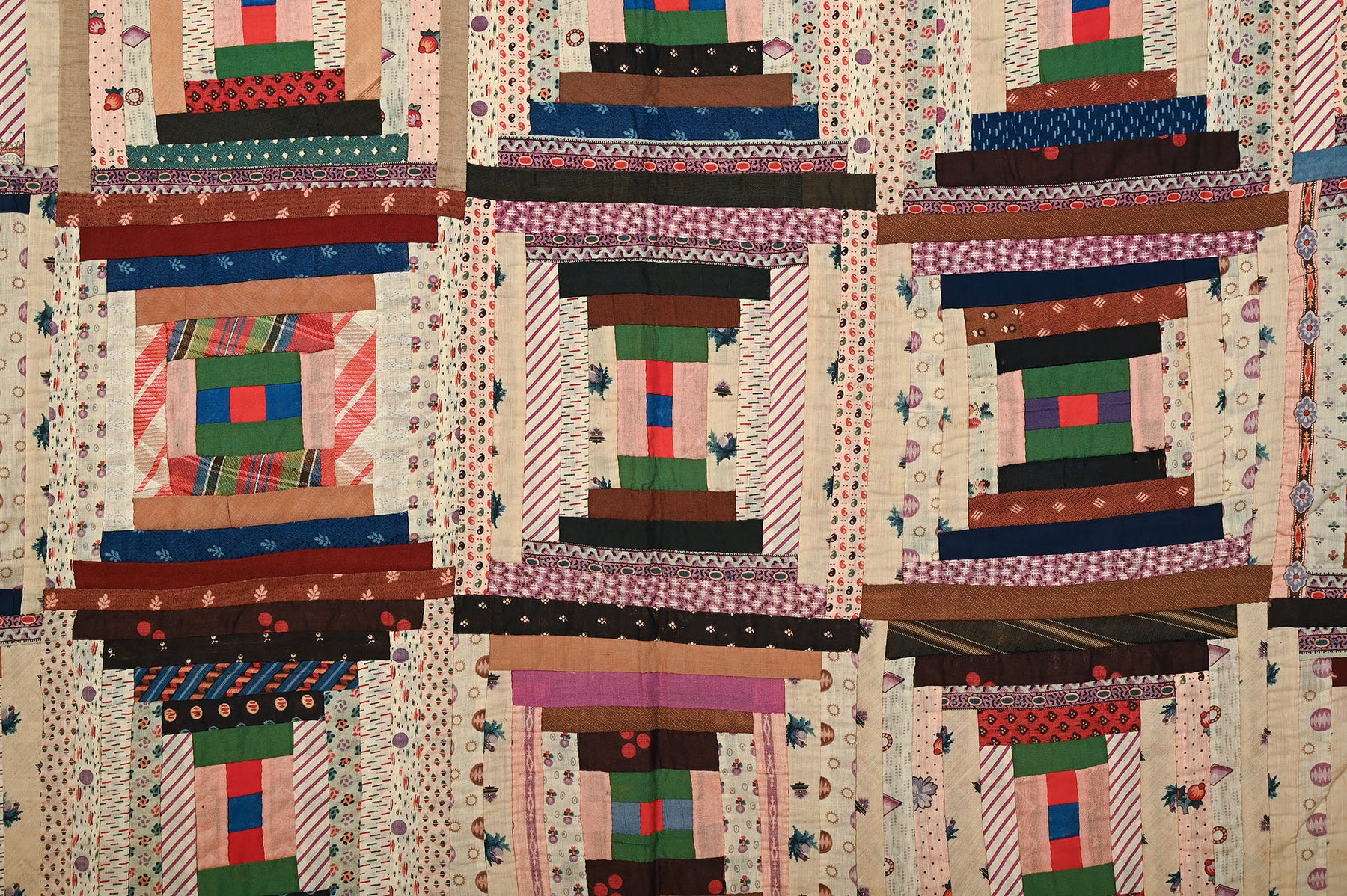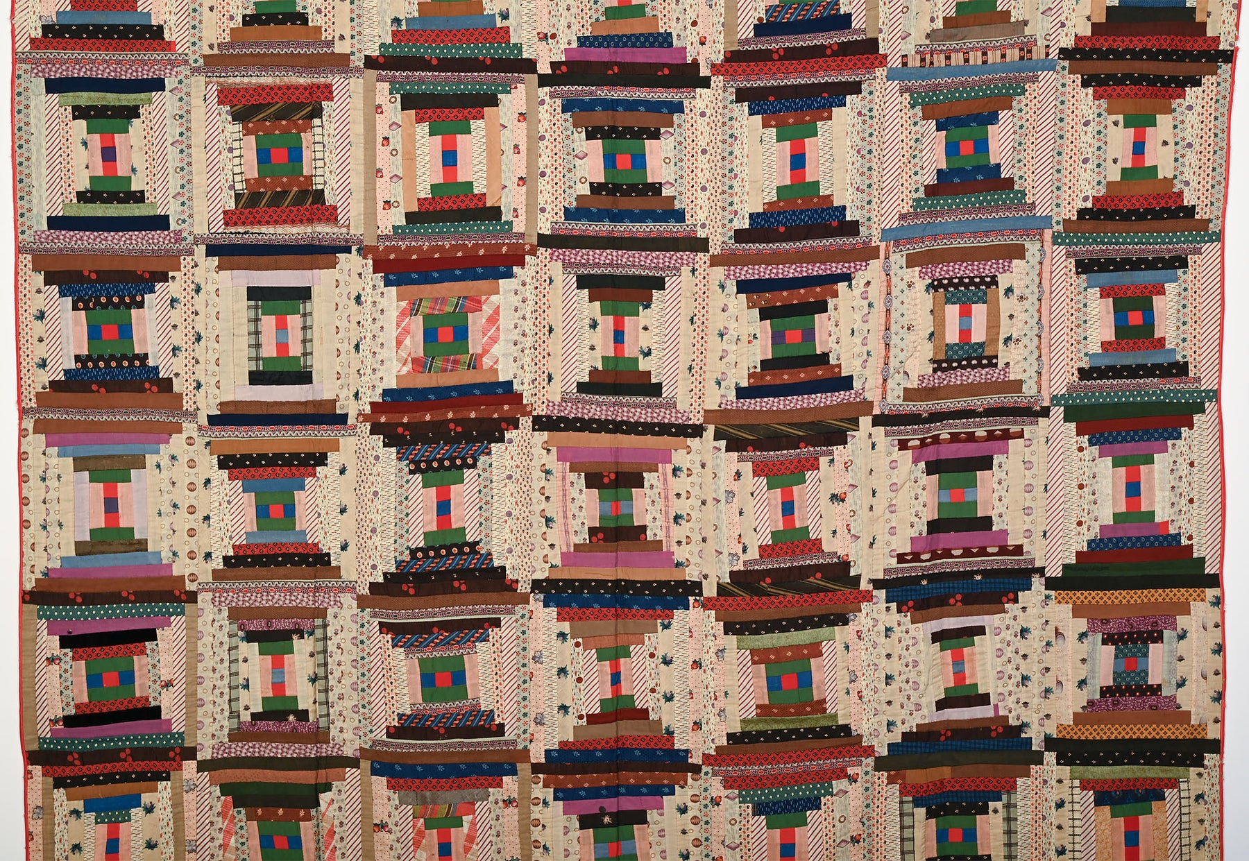 This Courthouse Steps Log Cabin quilt is made of a beautuful mix of wool challis fabrics. The overall tone of the quilt is lighter than one usually sees. Almost all of the fabrics are prints with solid red, blue and green placed in different ways in the centers. The backing is a brown cotton print. The quilt does not have batting as is often the case with Log Cabins of this type. Condition is excellent.