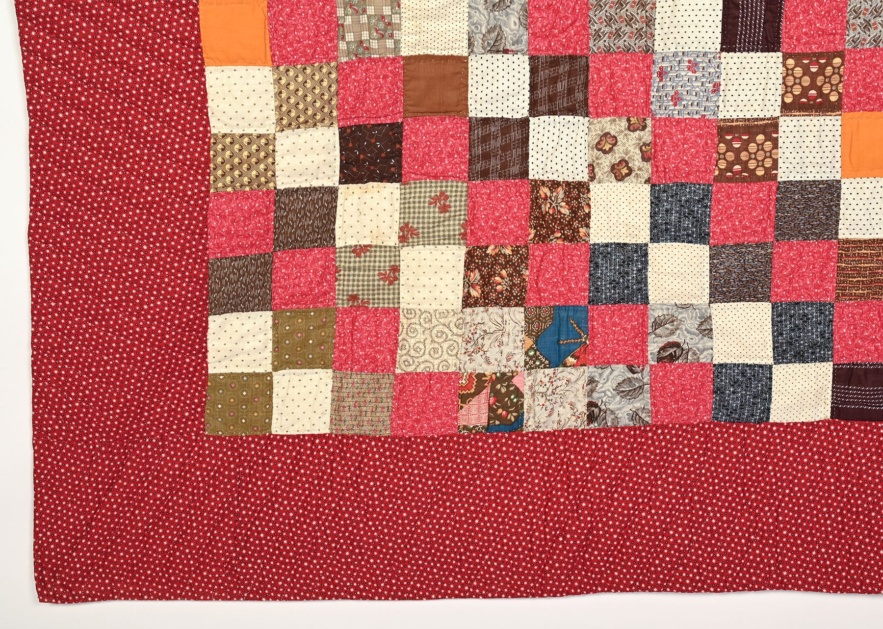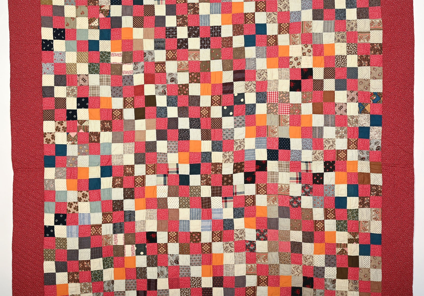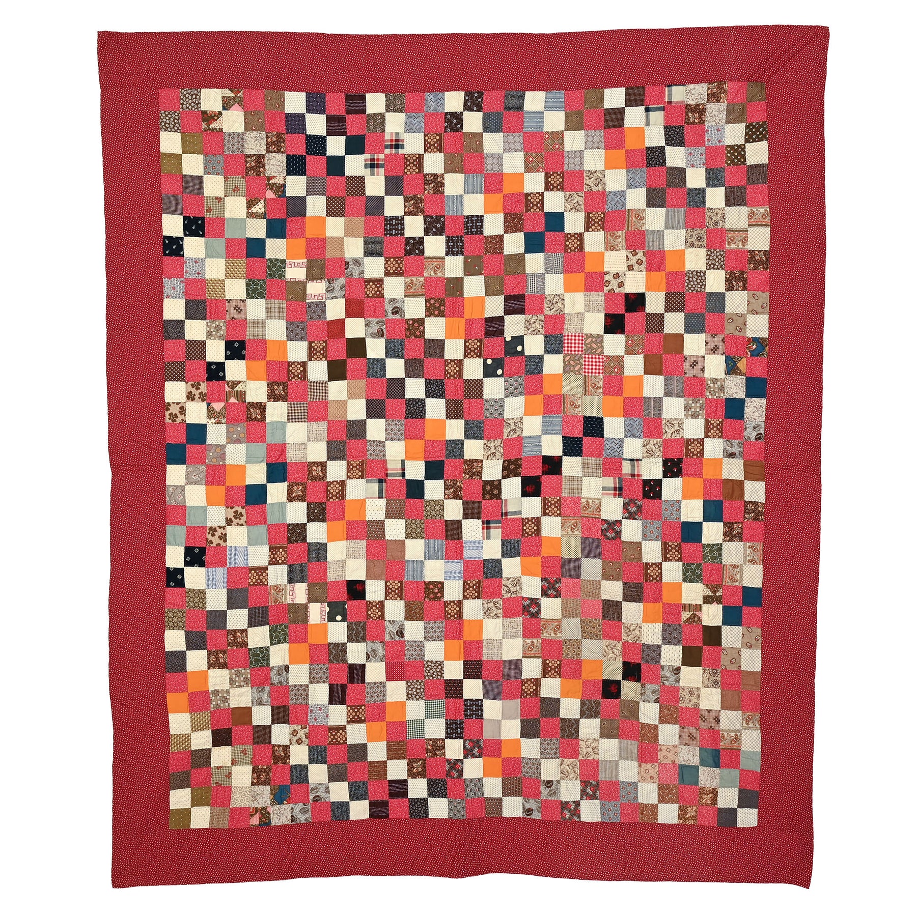 This sophisticated country quilt takes a traditional Four Patch and adds a diagonal pattern by the consistent use of pink and white (shirting prints) blocks. Each square measures 2 inches to a side.  The quilt is in pristine, unwashed condition. The backing is a plain cotton muslin. It measures 68" x 78". Pennsylvania origin; made 1880's.