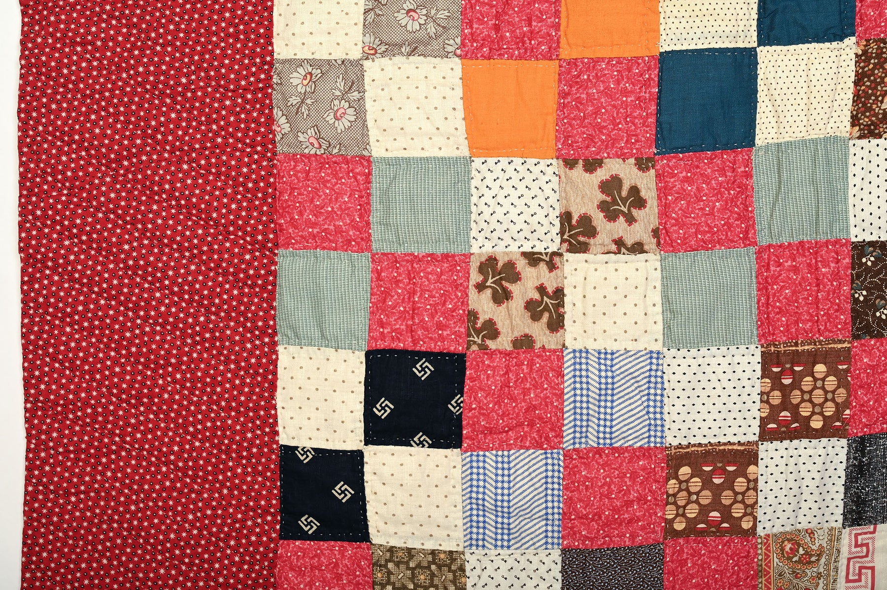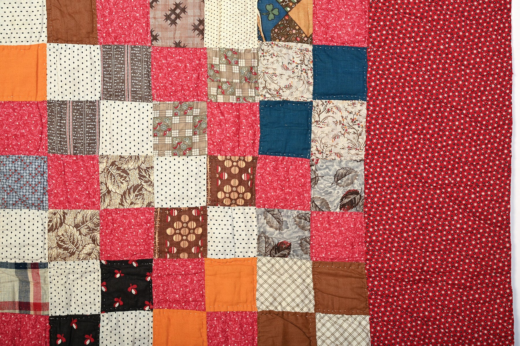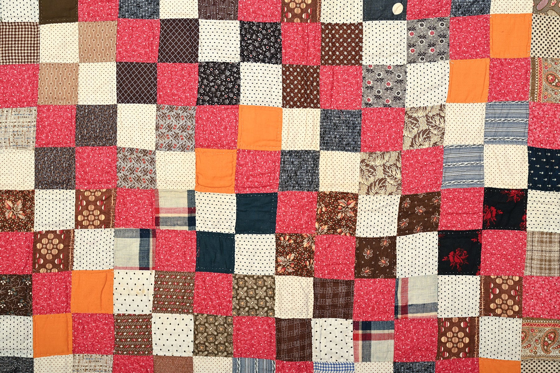 This sophisticated country quilt takes a traditional Four Patch and adds a diagonal pattern by the consistent use of pink and white (shirting prints) blocks. Each square measures 2 inches to a side.  The quilt is in pristine, unwashed condition. The backing is a plain cotton muslin. It measures 68" x 78". Pennsylvania origin; made 1880's.