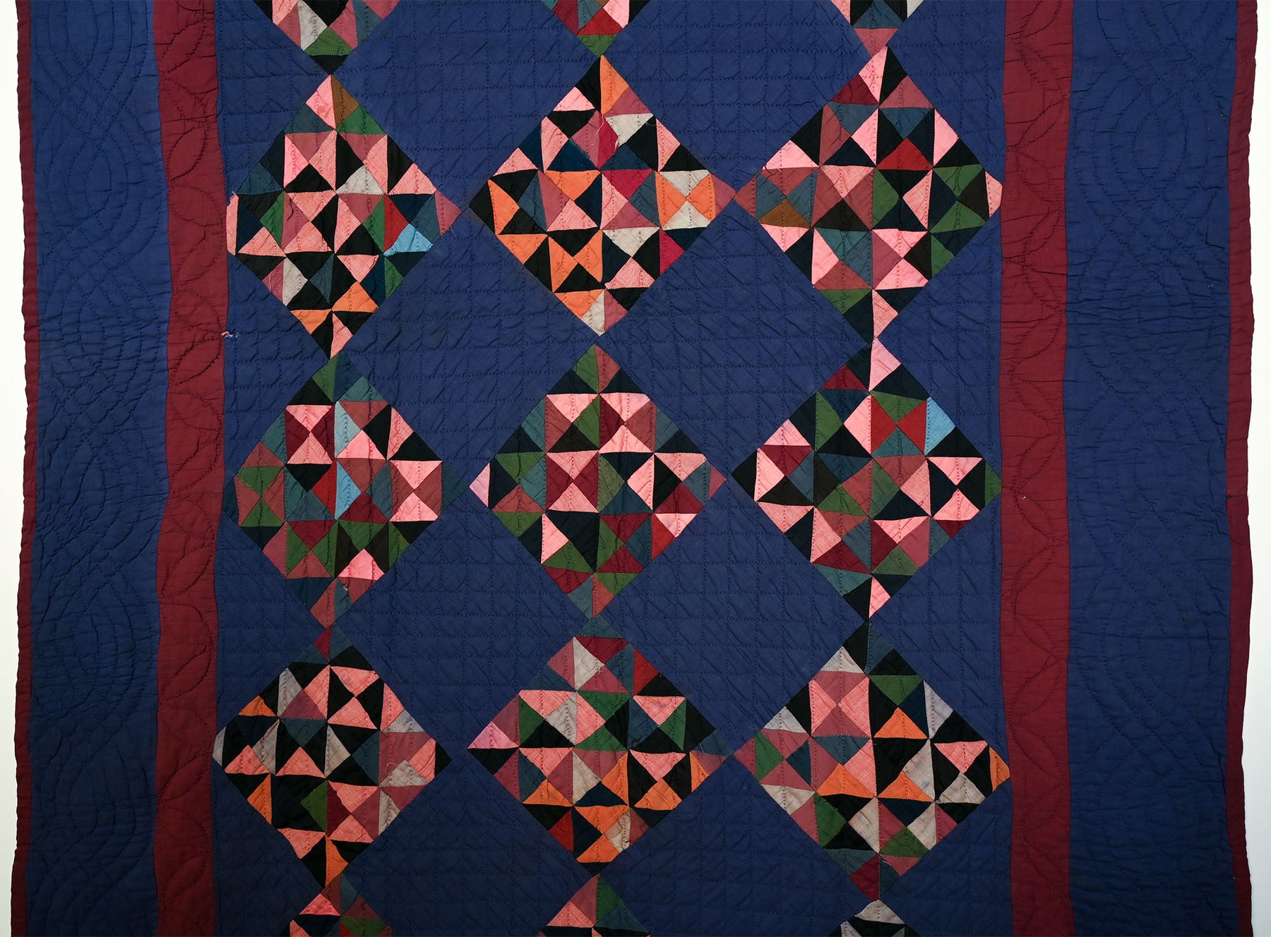 Unusual Broken Dishes quilt in that it is not arranged as the usual allover pattern but rather in diamond shaped blocks. The lights and darks are sprinkled throughout to give something of a kaleidoscopic effect. Use of the same maroon for the binding and inner border adds nice continuity. Cable quilting in the border and one inch squares throughout the indigo off blocks. Excellent condition with one small, inconspicuous tear between the inner border and the indigo ground. It is 1/4" x 3/4". Made of cotton; circa 1910. Holmes County, Ohio Amish origin. Measurements are 44" x 74".