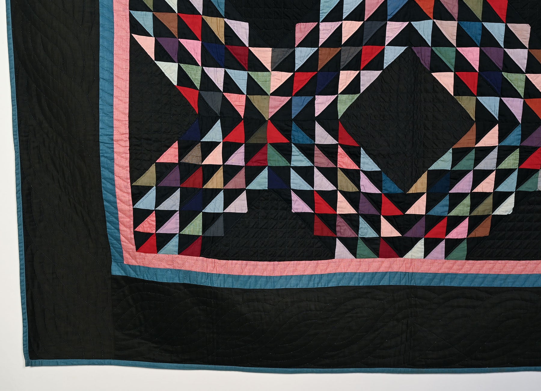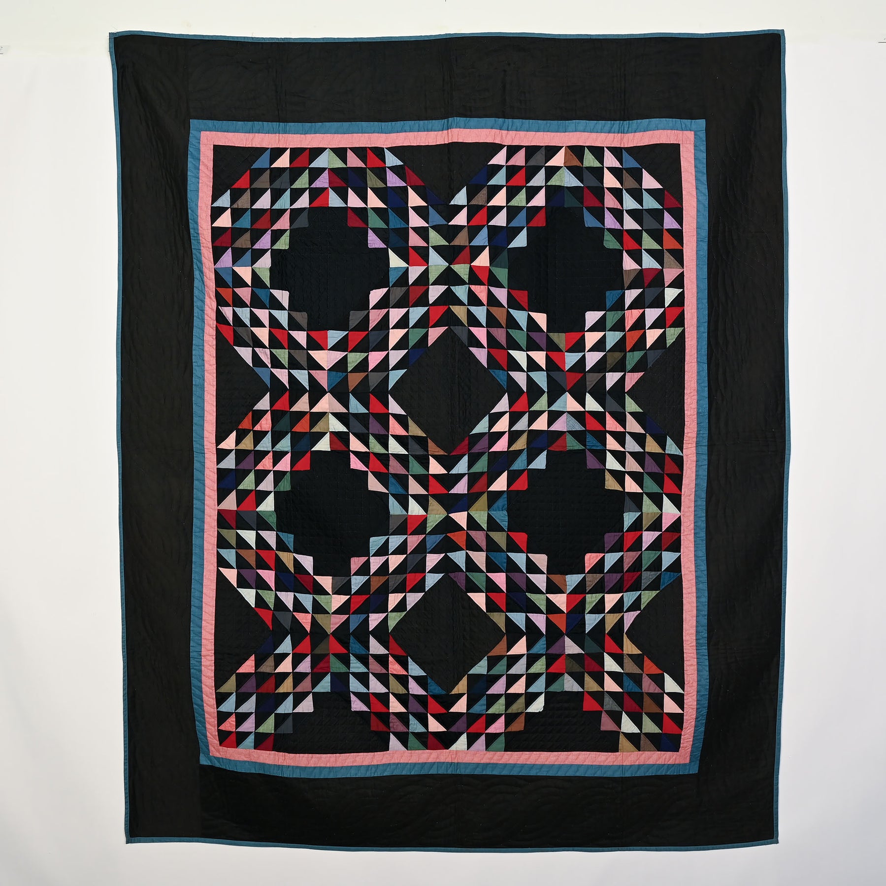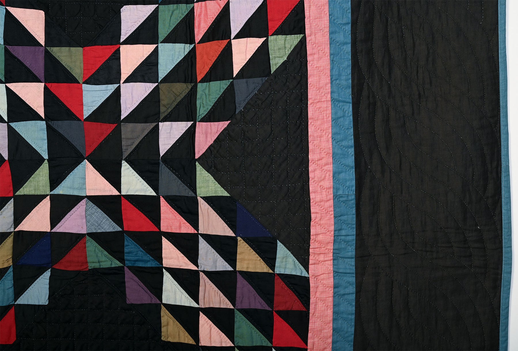 Pristine version of an Ohio Amish (Sugarcreek; Holmes County) Ocean Waves quilt. The pastel colors are highlighted with reds scattered throughout. Well quilted with a cable pattern along the border and smaller than one inch squares throughout the body of the quilt. The black fabric is a lightly polished cotton. Measurements are 66" x 79". Unwashed condition; made circa 1920.