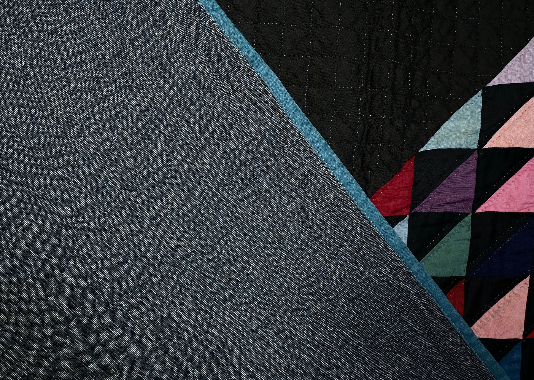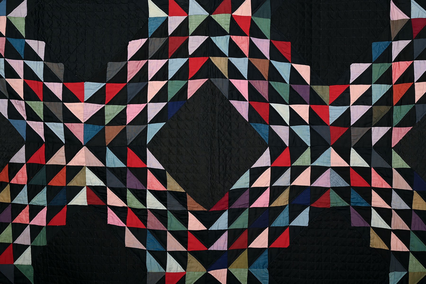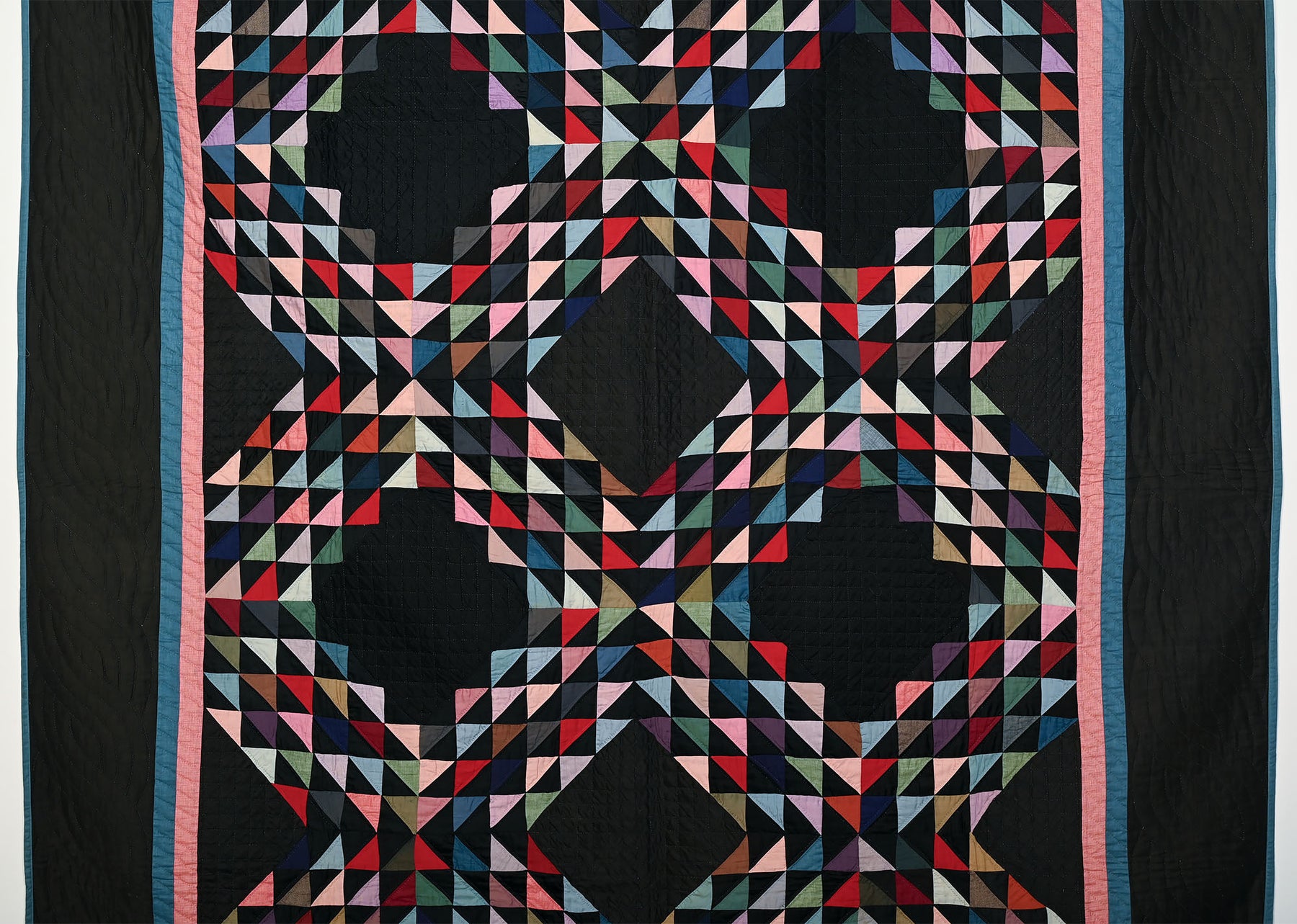 Pristine version of an Ohio Amish (Sugarcreek; Holmes County) Ocean Waves quilt. The pastel colors are highlighted with reds scattered throughout. Well quilted with a cable pattern along the border and smaller than one inch squares throughout the body of the quilt. The black fabric is a lightly polished cotton. Measurements are 66" x 79". Unwashed condition; made circa 1920.