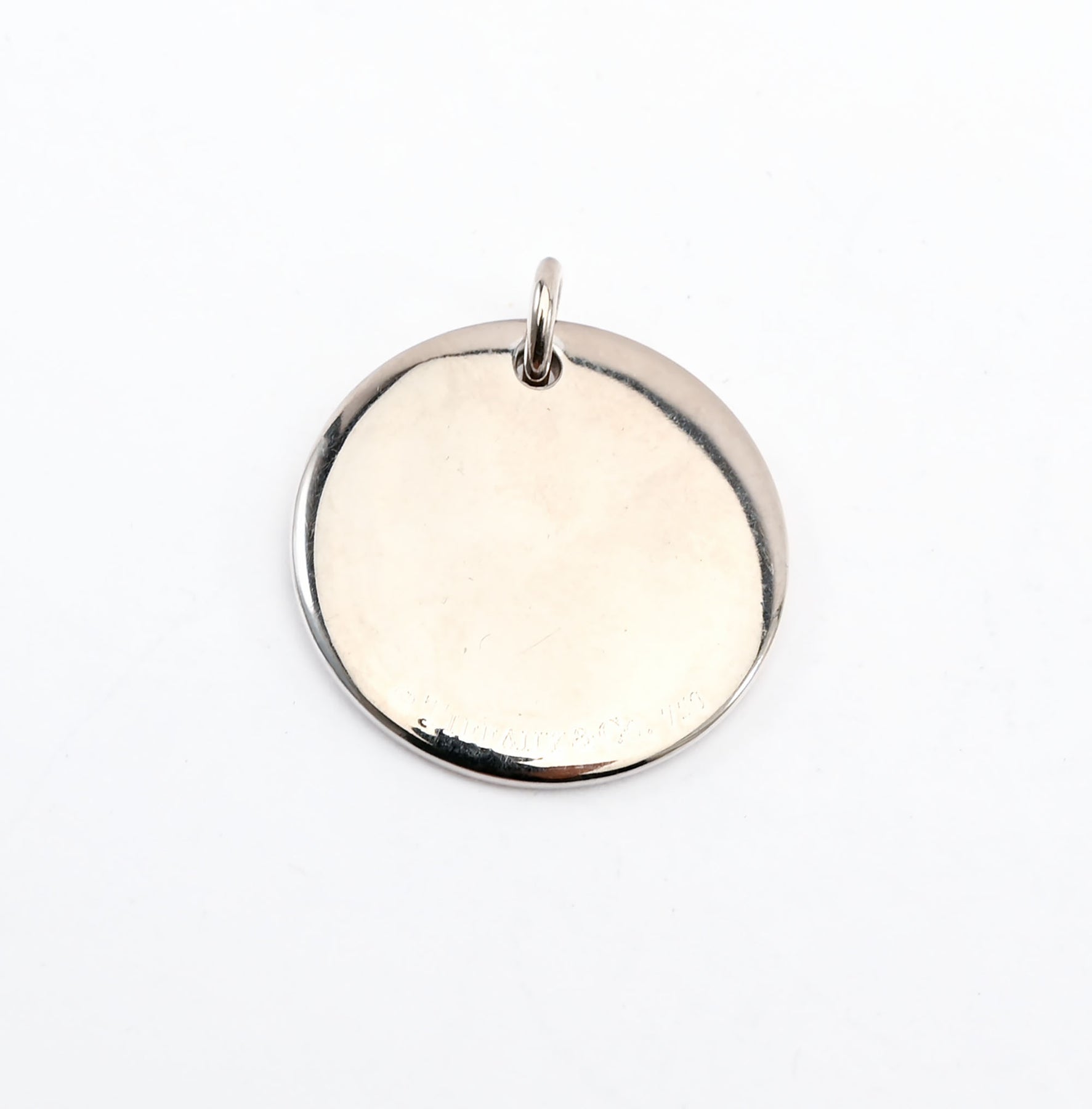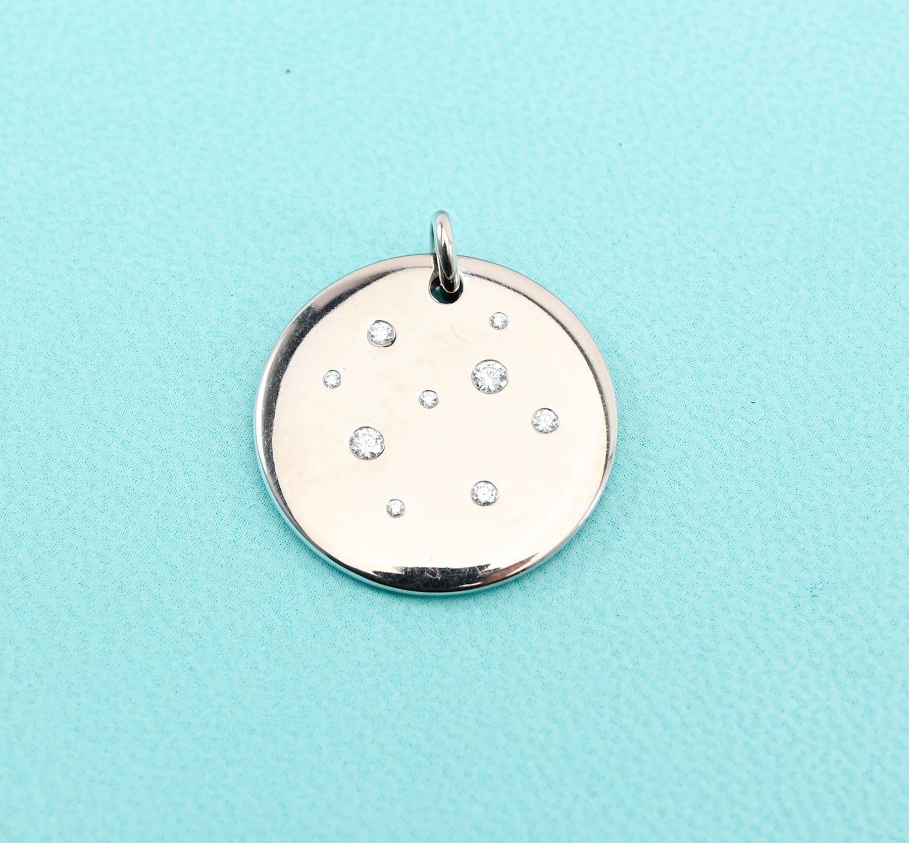Tiffany pendant in 18 karat white gold with diamonds. There are nine stones in a variety of sizes which adds to the twinkle of the pendant. The pendant measures one inch in diameter. The Tiffany stamp is difficult to see in the photos but clear in real life. Condition is excellent.