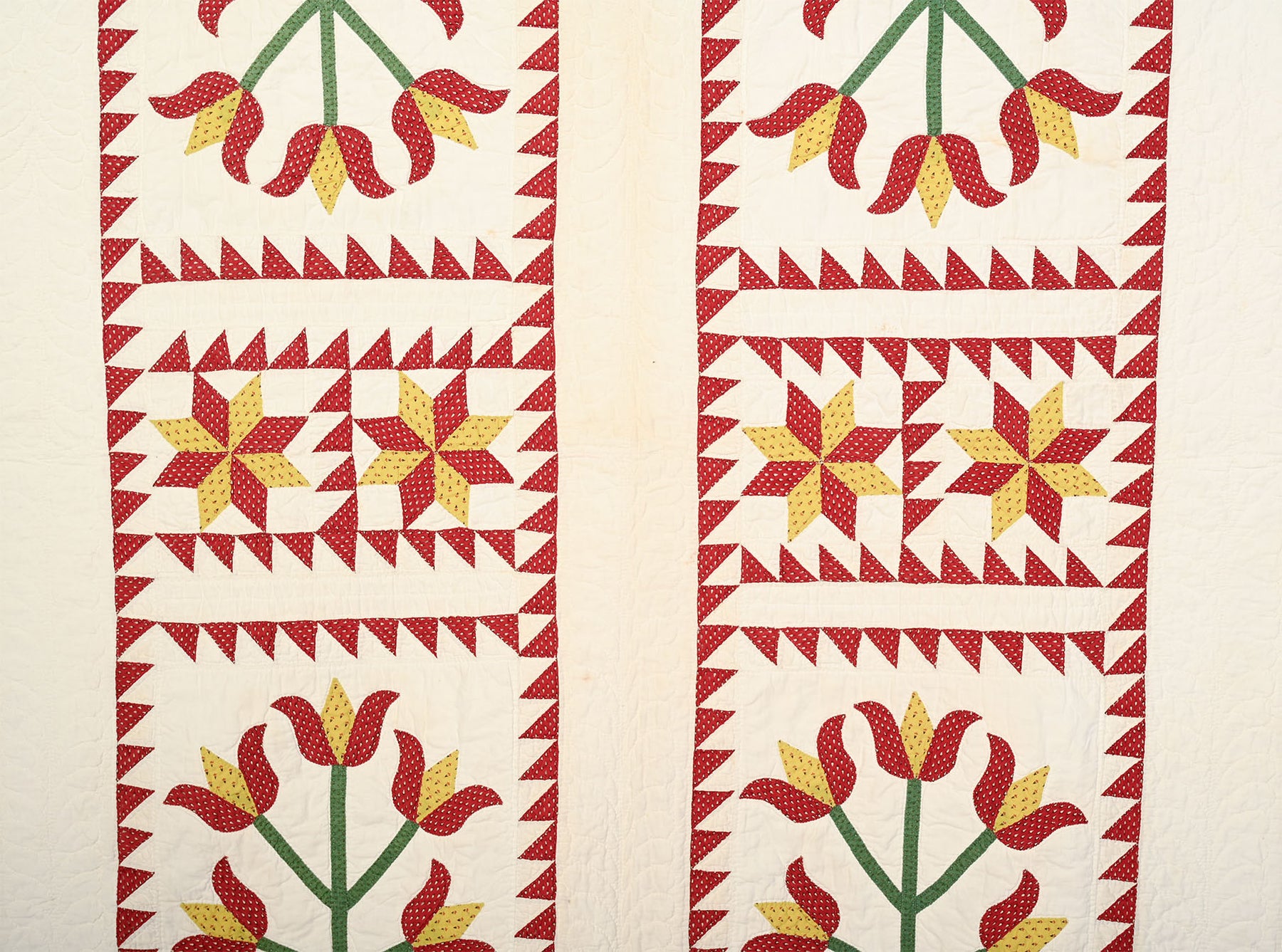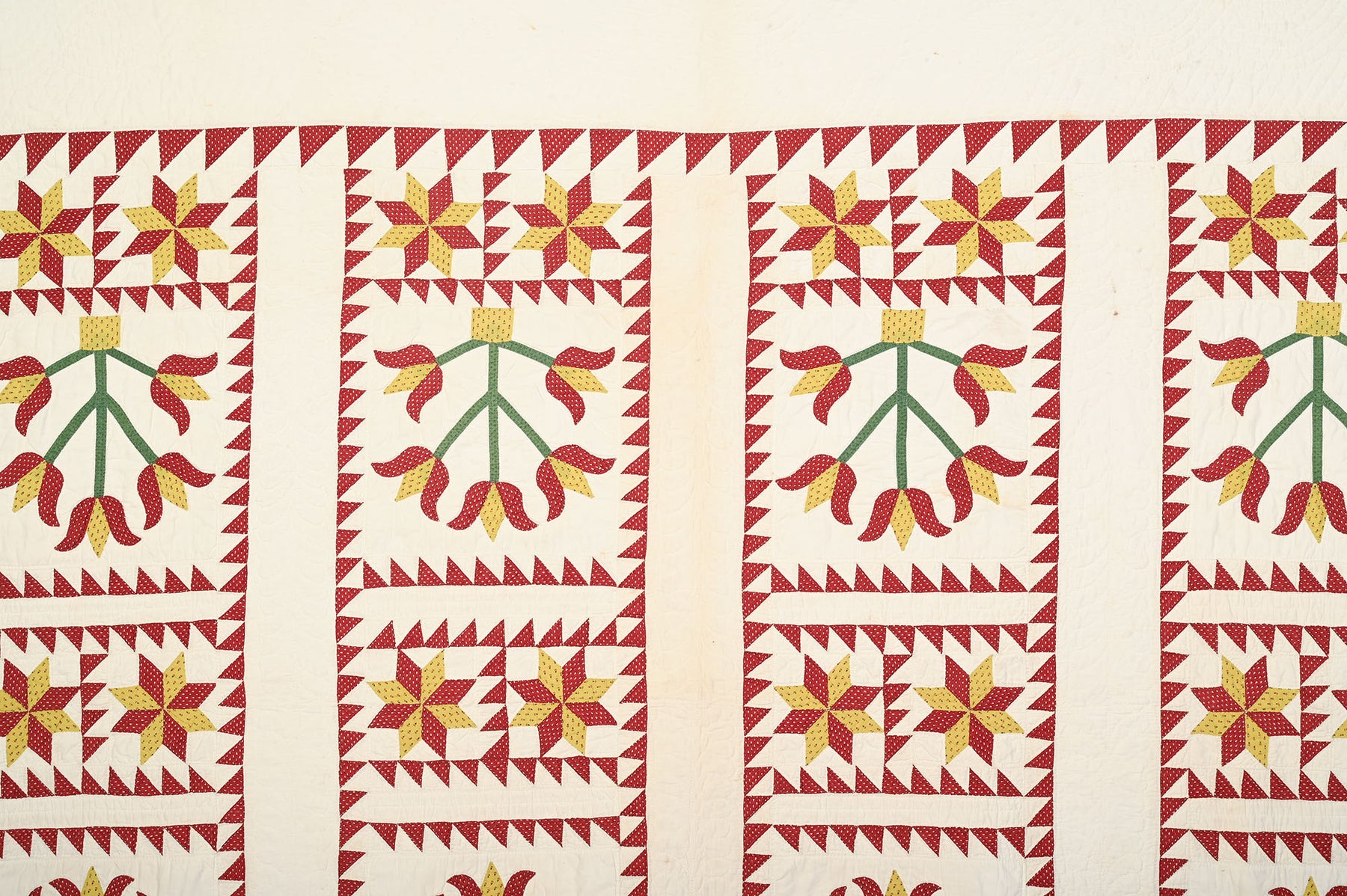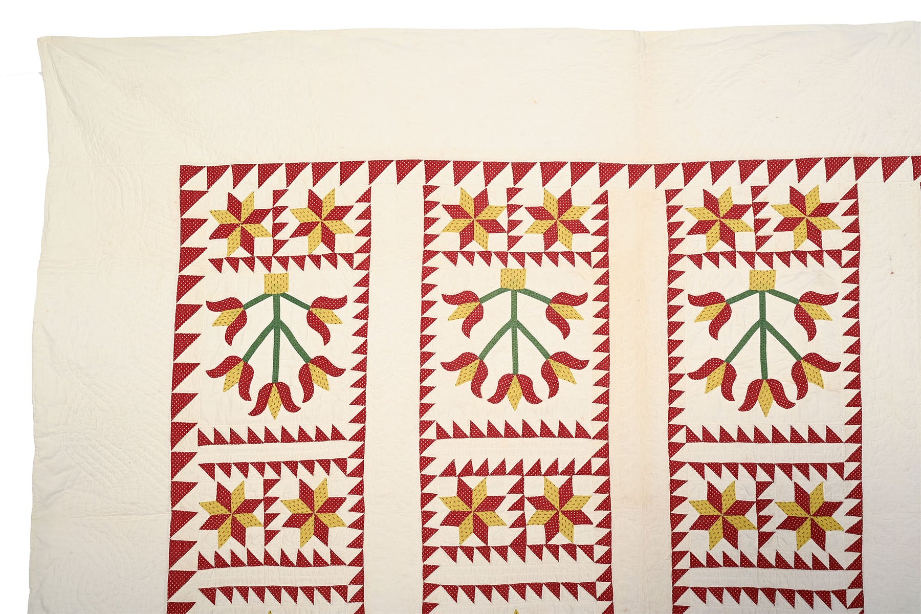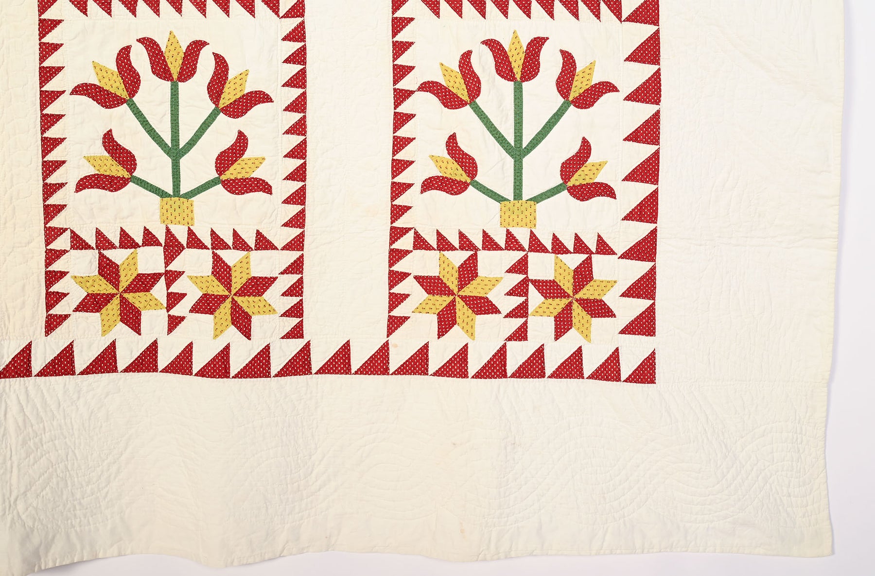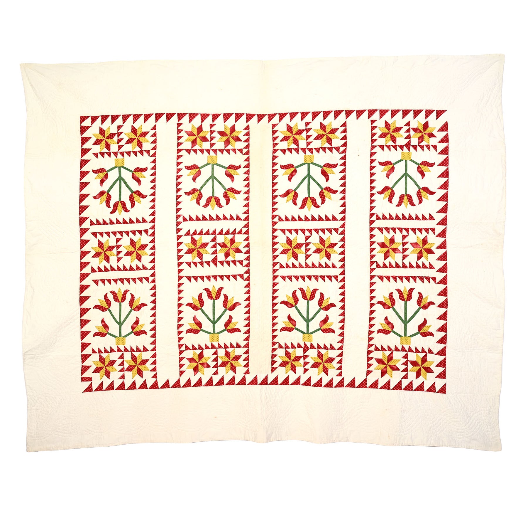 This Pots of Flowers quilt combined with LeMoyne Stars is an unusual and very successful combination. Each flower block is framed by a sawtooth border. Similarly framed between the flower blocks are LeMoyne Stars. The composition works well both vertically and horizontally. The quilt is nicely stitched with a cable pattern throughout the border and continuous feathers throughout the plain white rows. Measurements are 78" x 88". Pennsylvania origin; made 1870's. Condition is excellent.