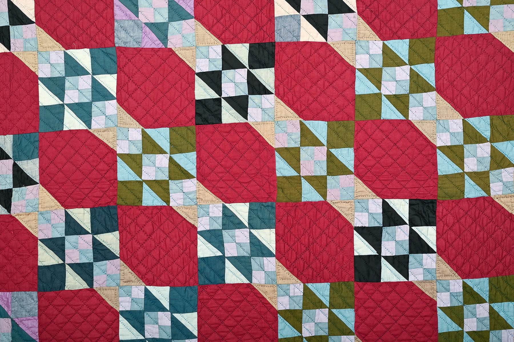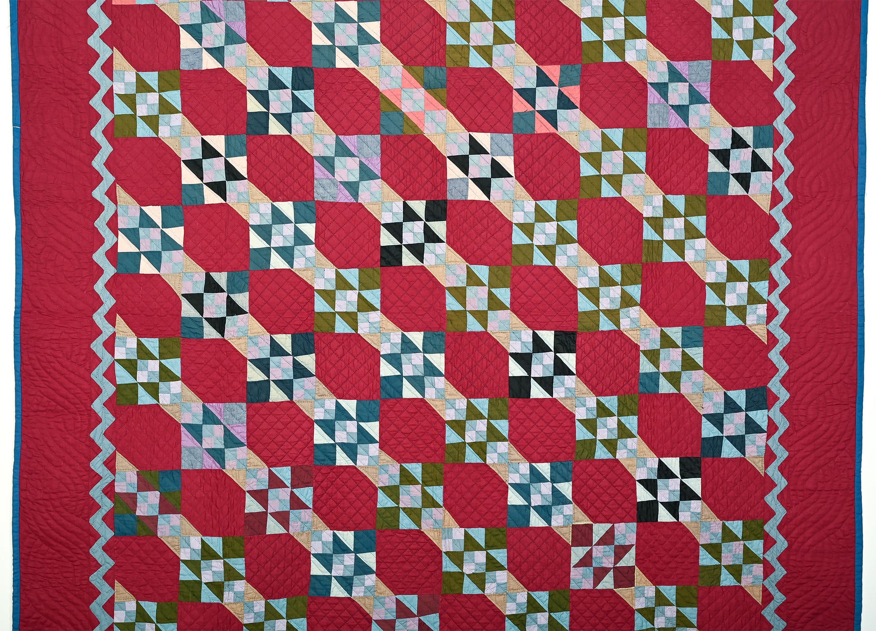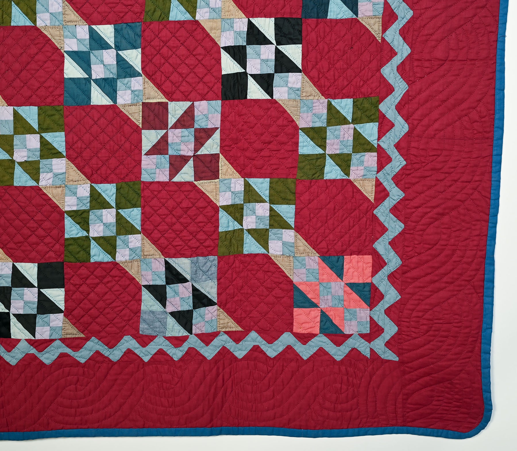 Setting the Jacob's Ladder blocks to create a strong diagonal pattern makes this quilt an unusual standout. The blocks are set on a warm cherry red ground. The blues in the body of the quilt are carried through in the zigzag frame. Blocks are quilted with diamonds and a cable for the red border. The backing is a plain muslin. Condition is excellent. The quilt measures 69" x 78". Made circa 1920; Mt. Hope, Holmes County, Ohio Amish origin.