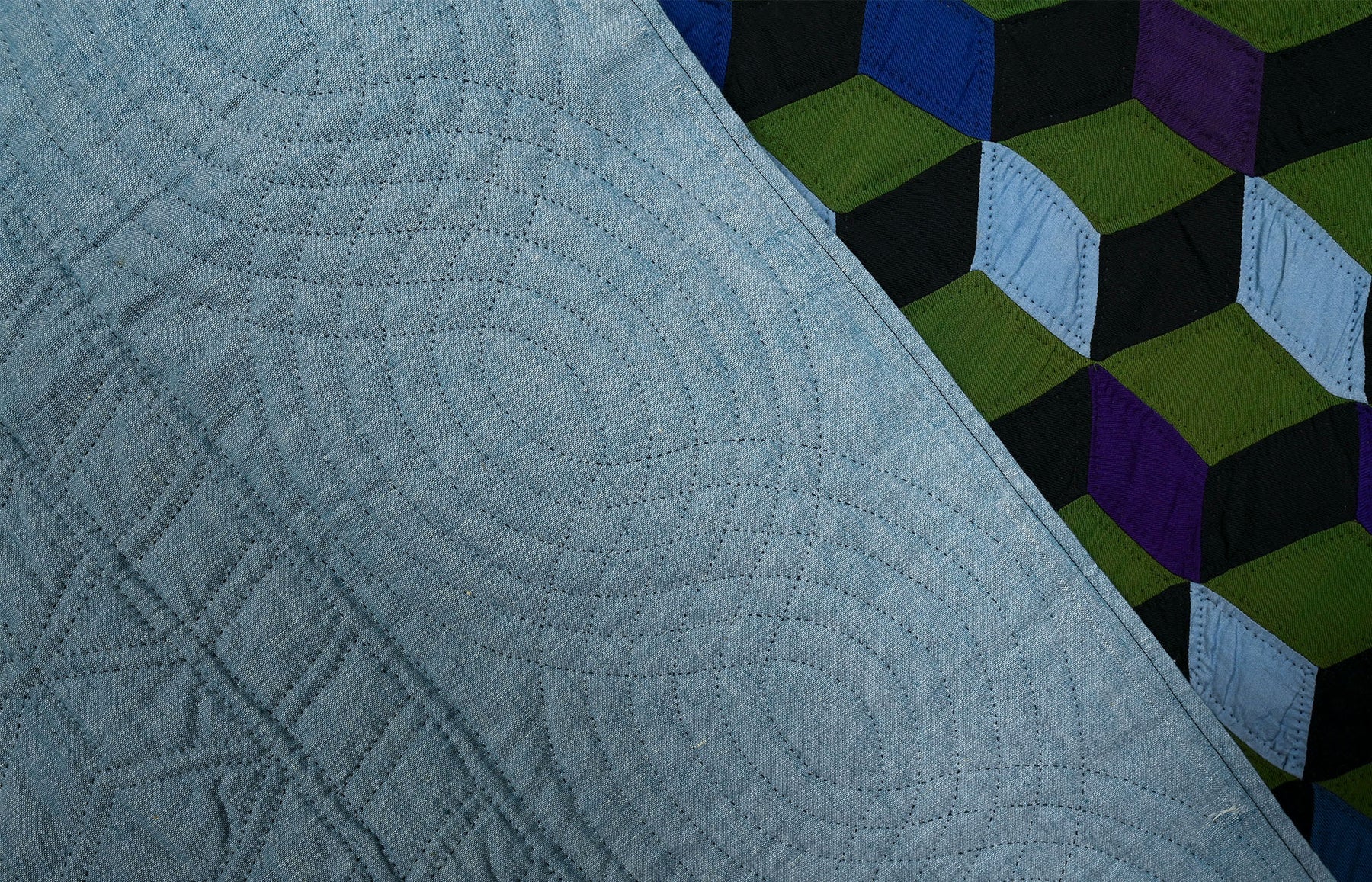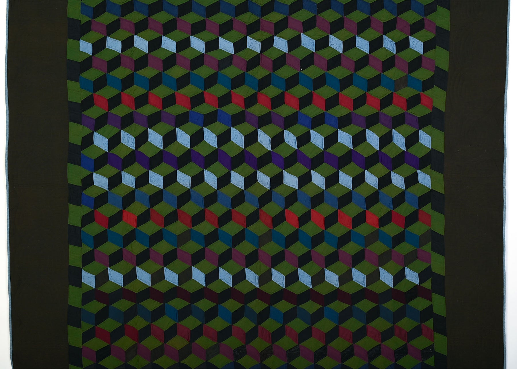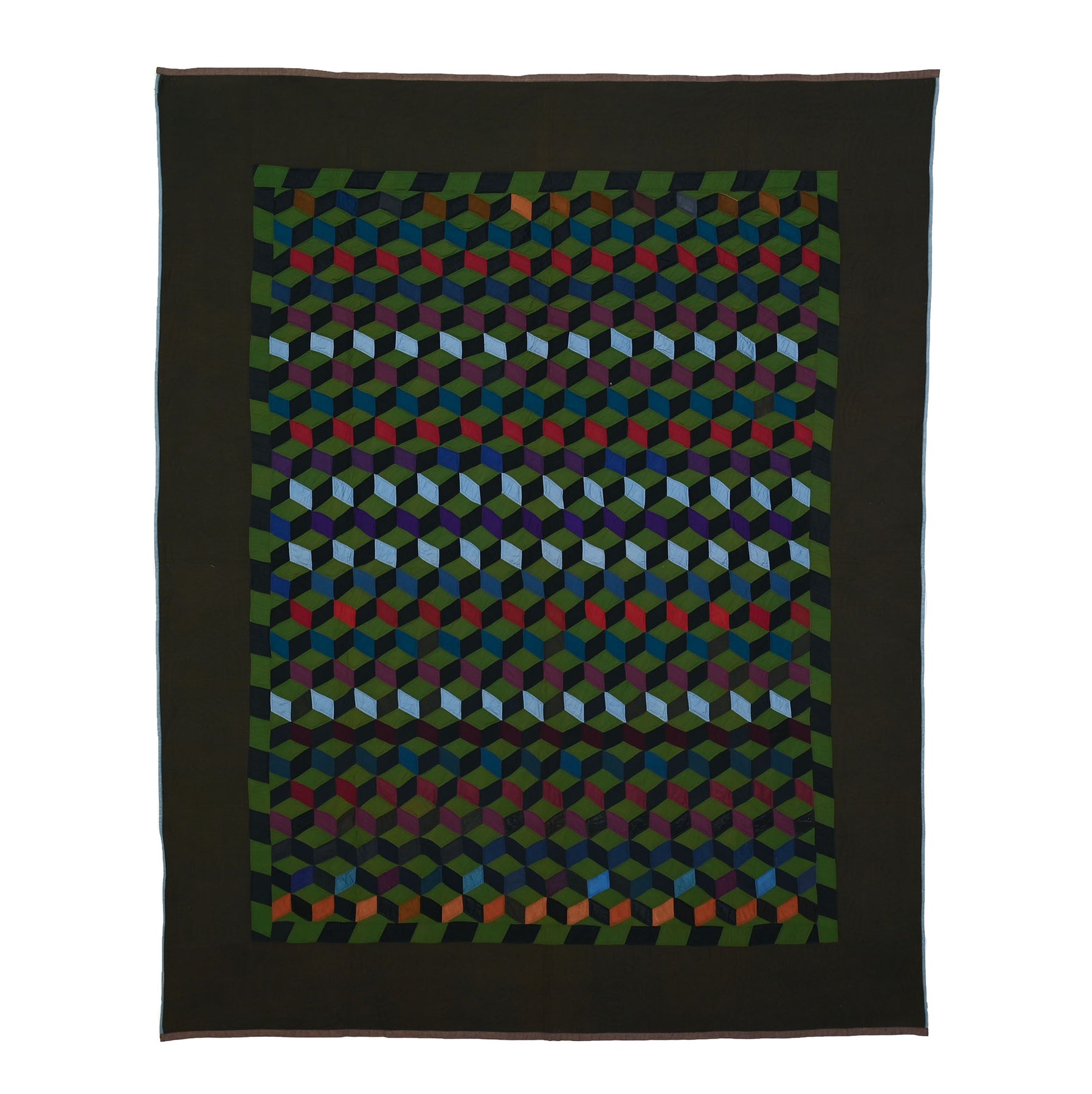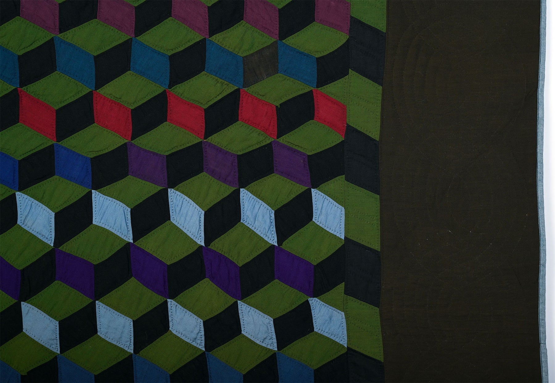 This is an exceptionally well made Ohio Amish Tumbling Blocks quilt. It was made by Anna Yoder of Holmes County, Ohio. The outer border is wool with the blocks made mostly of wool with a bit of black cotton. Condition is pristine. The placement of colors adds dimensionality to an already three dimensional pattern. The outer border is quilted with a cable pattern. Measurements are 68" x 83". The backing is a blue cotton chambray. Made circa 1920.